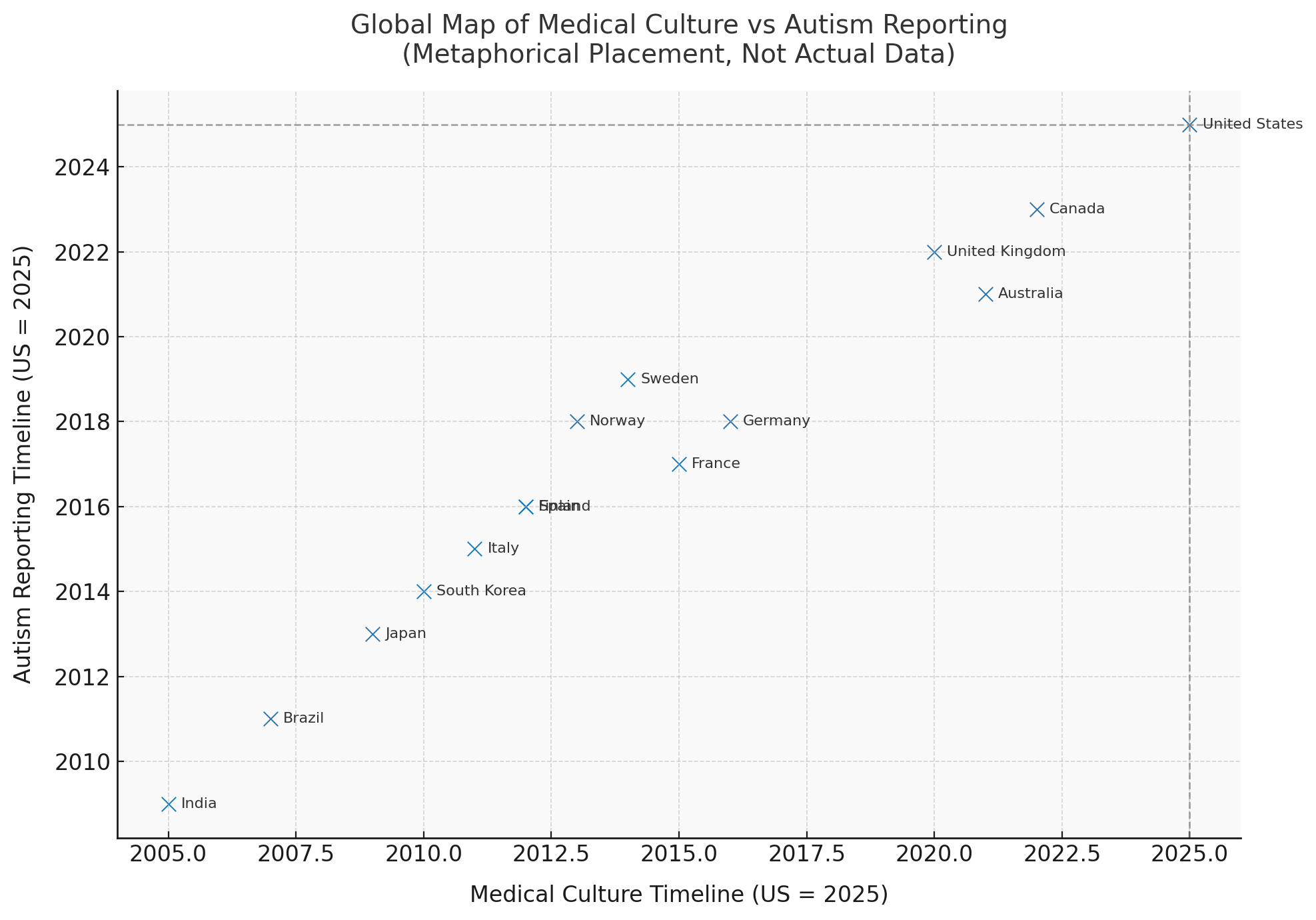 Figure: A metaphorical “global map” comparing medical culture (x-axis) and autism reporting culture (y-axis), with the United States set as 2025. Countries further to the “right” represent cultures quicker to medicate and suppress fever; countries higher on the chart represent cultures further along in reporting and diagnosing autism. This is not a prevalence chart but a conceptual illustration of how fever management practices and autism diagnoses may trend together.